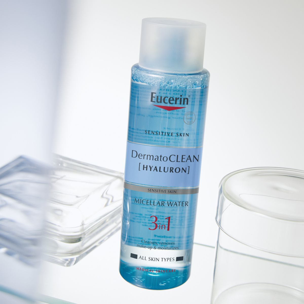 Eucerin DermatoCLEAN [HYALURON] micelarna otopina brzo je i praktično rješenje za čišćenje pogodno za sve tipove kože, a klinički i dermatološki dokazano i za osjetljivu kožu.