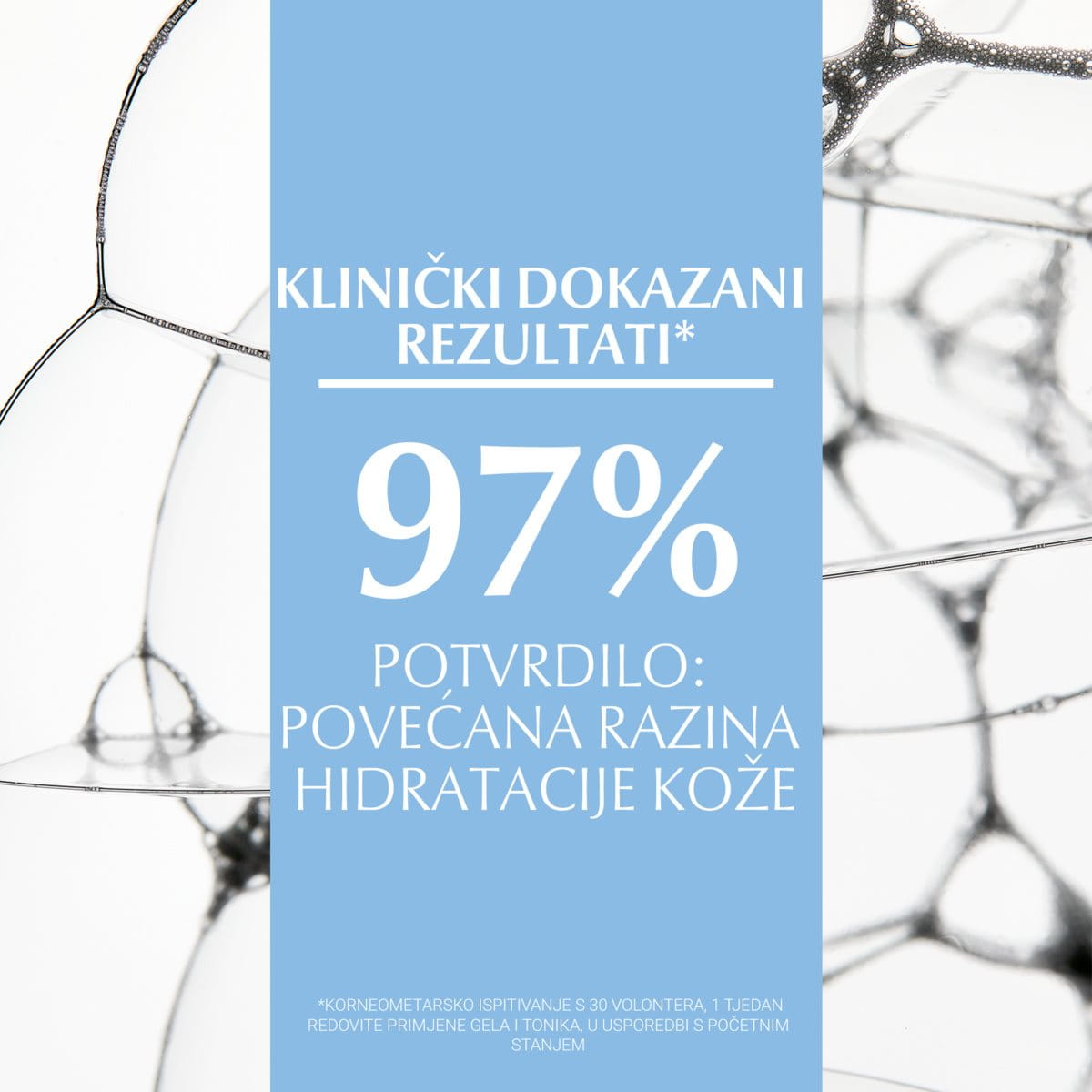 Istraživanje o hidrataciji1 provedeno je na uzorku od 29 žena u dobi između 25 i 64 godine. Uzorak je koristio Eucerin DermatoCLEAN [HYALURON] tonik u kombinaciji s Eucerin DermatoCLEAN [HYALURON] gelom za čišćenje dva puta dnevno tijekom jednog tjedna. Rezultati su procijenjeni pomoću korneometra (senzora koji se najčešće koristi za mjerenje hidratacije kože) i rezultati su sljedeći: