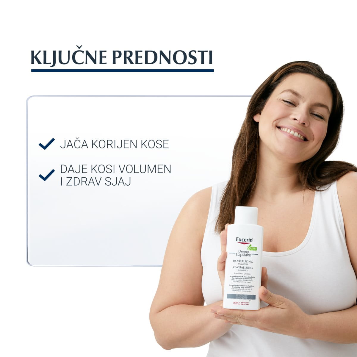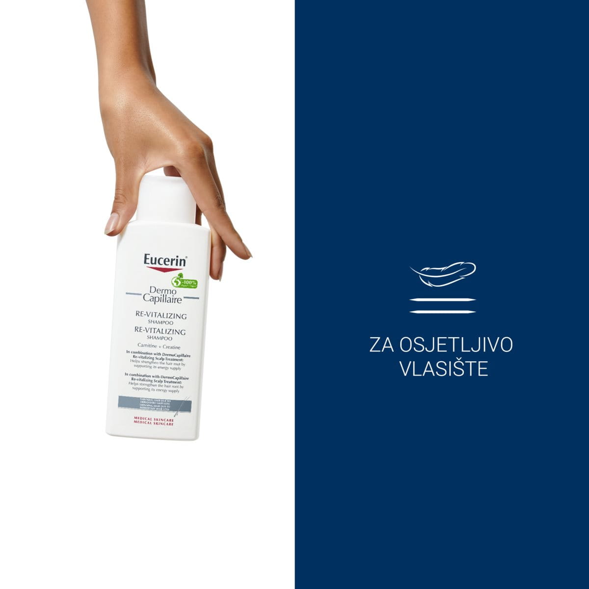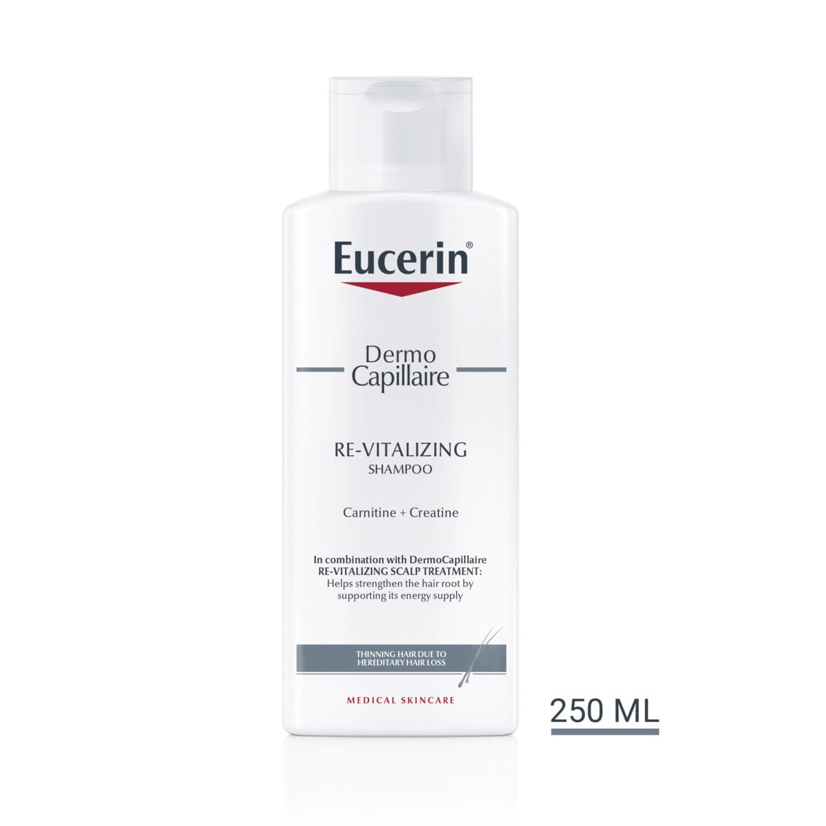 Eucerin DermoCapillaire revitalizirajući šampon posebno je dizajniran za osobe s oštećenjem kose uzrokovanog nasljednim gubitkom kose (najčešći uzrok gubitka kose kod muškaraca i žena). Sadrži dvije aktivne tvari koje se prirodno nalaze u tijelu, karnitin i kreatin kako bi ojačao korijen kose. Kada se koristi u kombinaciji s Eucerin DermoCapillaire revitalizirajućim tretmanom za kosu, snažan duo pomaže u jačanju korijena podržavajući njegovu opskrbu energijom. Eucerin DermoCapillaire revitalizirajući šampon i Eucerin DermoCapillaire revitalizirajući tretman za kosu pružaju joj zdravi sjaj te mekan i podatan osjećaj