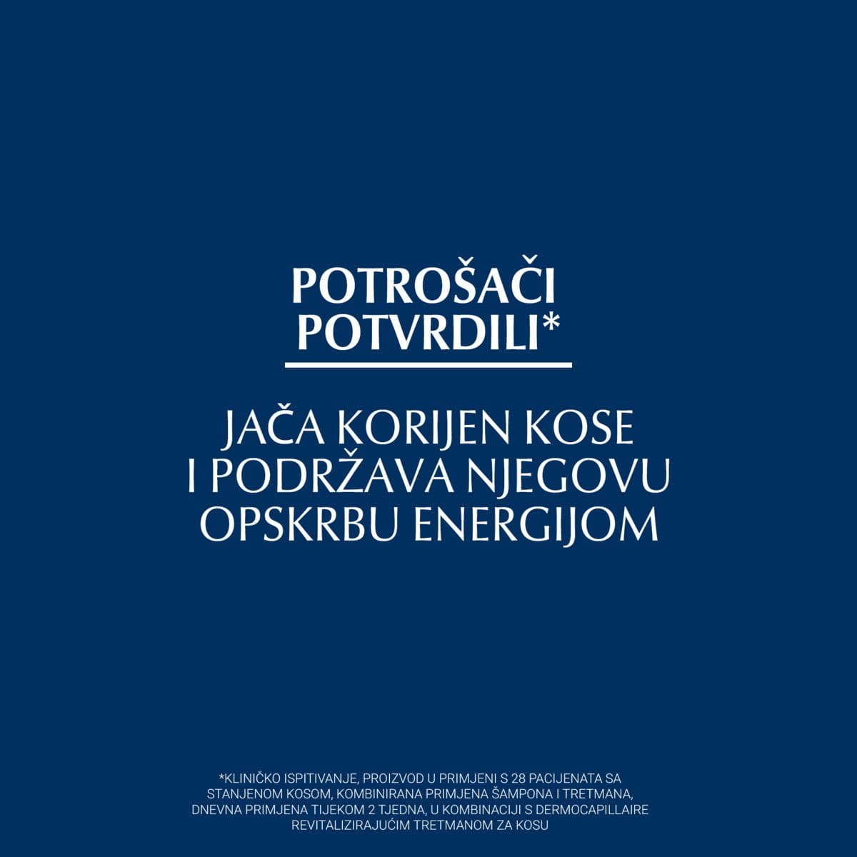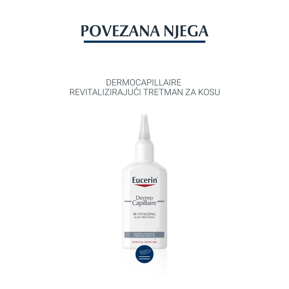 Eucerin DermoCapillaire revitalizirajući šampon posebno je osmišljen za pripremu vlasišta i snažnije djelovanje Eucerin DermoCapillaire revitalizirajućeg tretmana za kosu. Eucerin DermoCapillaire revitalizirajuća njega klinički i dermatološki dokazano pomaže jačanju korijena kose.
