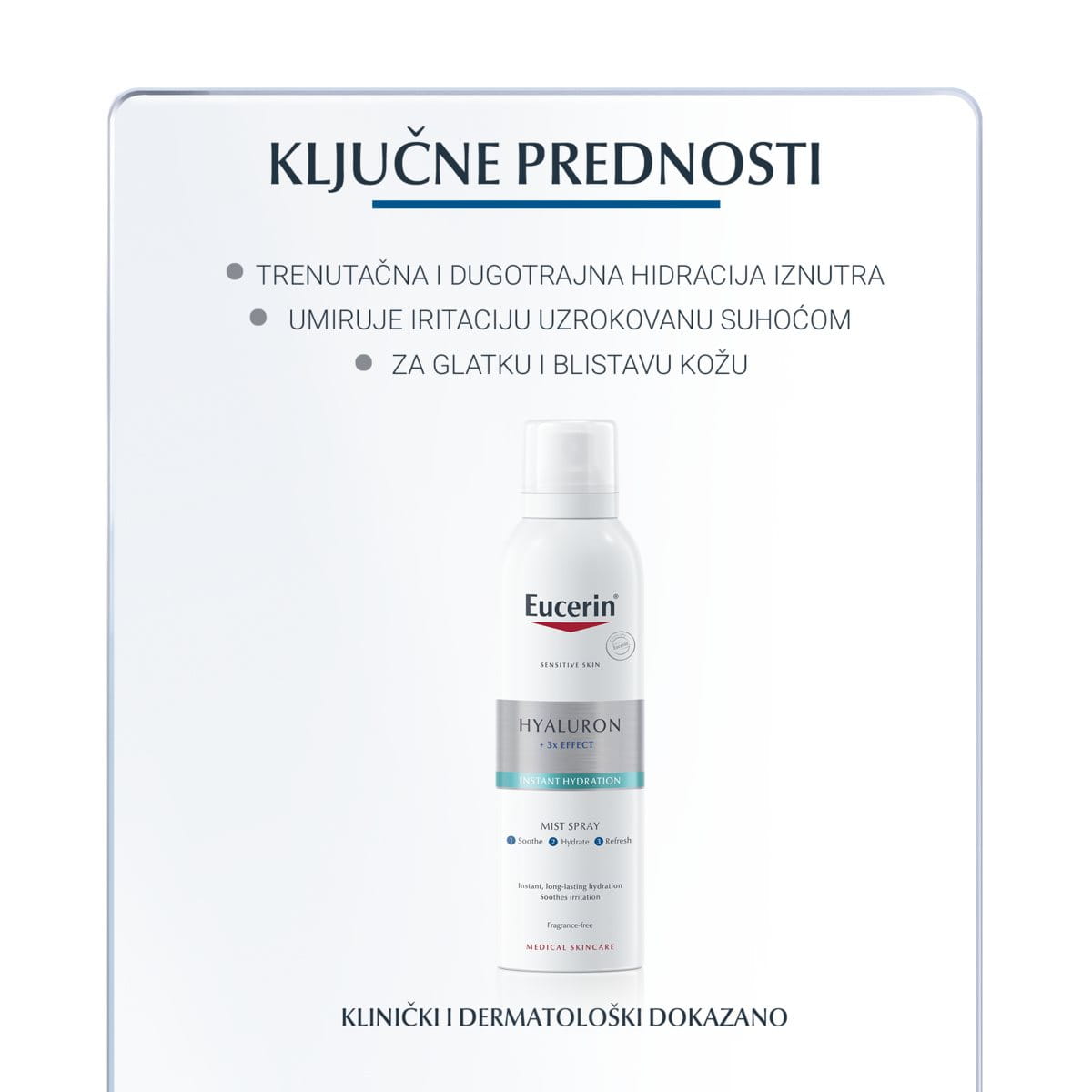Osvježavajući sprejevi koji ne sadrže hidratantne sastojke ne mogu vezati vlagu. Čista voda brzo isparava čineći kožu sušom nego prije pri čemu ona može postati osjetljiva. Jedinstvena formula u Eucerin Hyaluron osvježavajućem spreju za lice i tijelo poboljšava hidracijski sustav kože, ravnomjerno raspoređuje vodu, zadržava vlagu te kožu čini glatkom i blistavom.