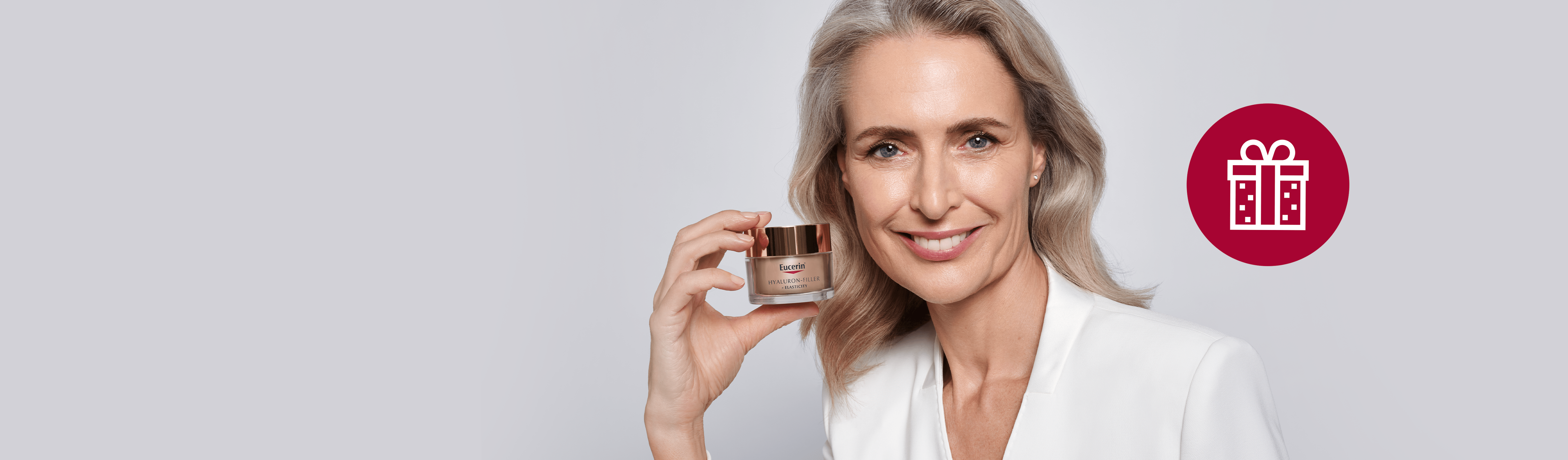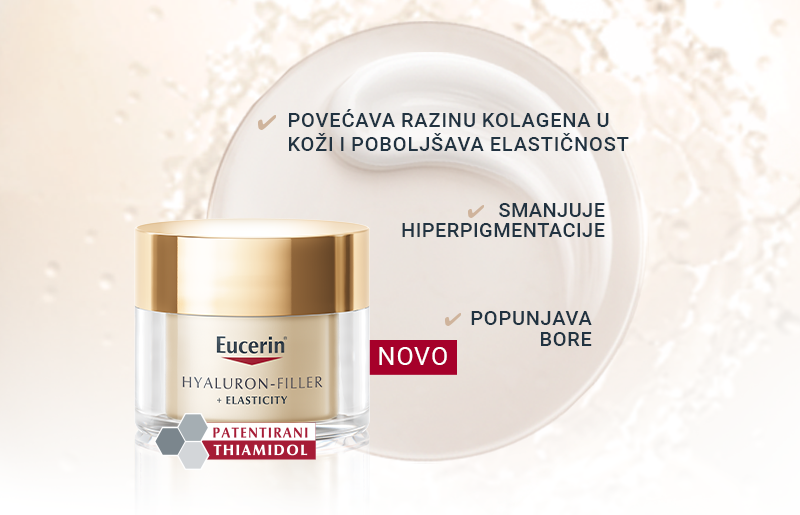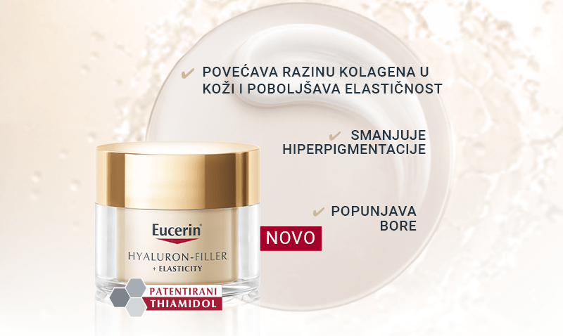 Kako starimo, koža prolazi kroz strukturne promjene. Gubi elastičnost i čvrstoću, a povećava se broj hiperpigmentacija i bora. Eucerin Hyaluron-Filler + Elasticity linija posebno je formulirana kako bi biološki pomladila i revitalizirala kožu. Inovativna kombinacija aktivnih sastojaka – hijaluronske kiseline, patentiranog thiamidola i kompleksa kolagena i elastina, klinički dokazano povećava razinu kolagena u koži, poboljšava elastičnost kože, smanjuje hiperpigmentacije i popunjava duboke bore.
